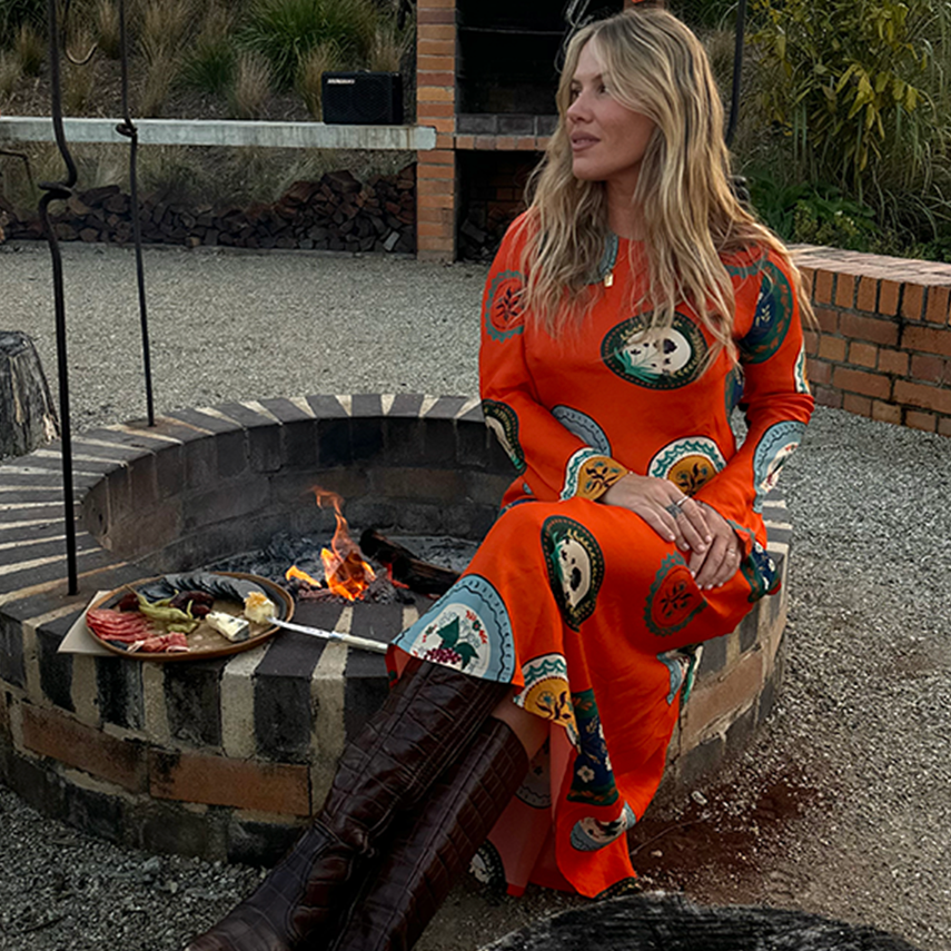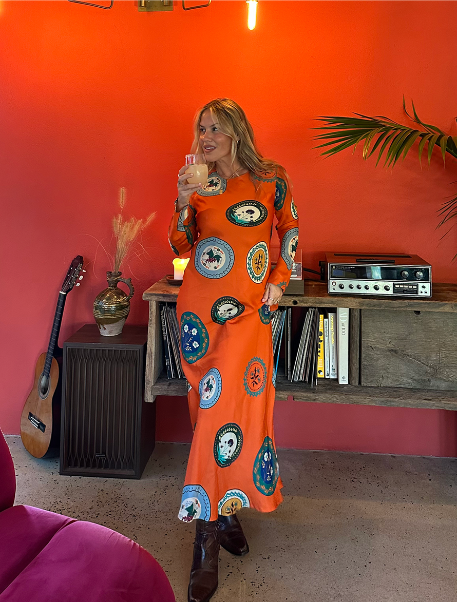 "There are so many pieces from the collection that I love! I love the Alessia Dress in Flower Ceramics with a pair of knee high boots and thick socks under to keep me cosy! And I adore the Roma Dress in Orange Plates with a great suede jacket and boots!"