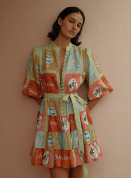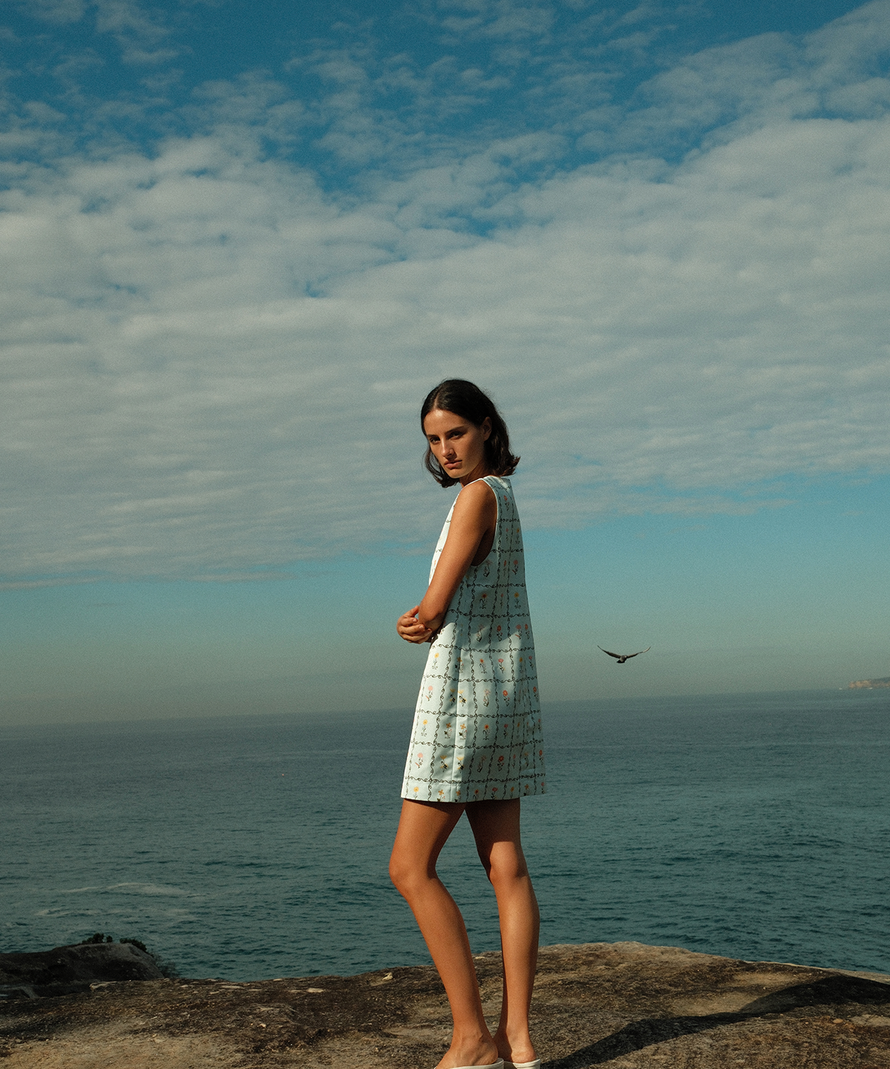 A soft palette of sky blues and sun-faded tones meets bold graphic motifs, bringing a playful energy to effortless dressing.