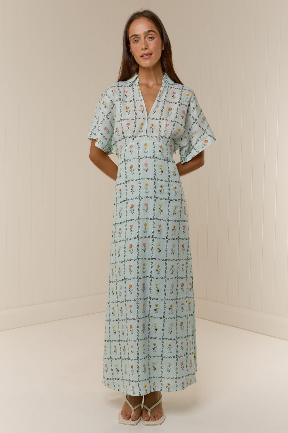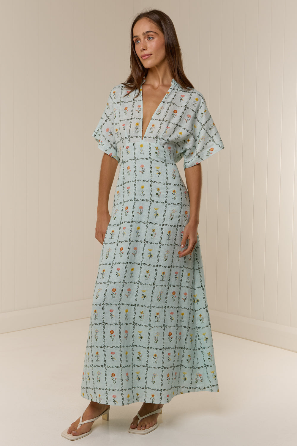 The Jasmine Dress is crafted from Premium Linen, printed in our exclusive Calypso Tile. Offering a relaxed, flattering fit with oversized sleeves that blend in to a slim A-line skirt. The neckline is a flattering deep V-shape that also features a hidden hook and eye for additional coverage if desired. Please refer to our size and fit guide for further fit details.