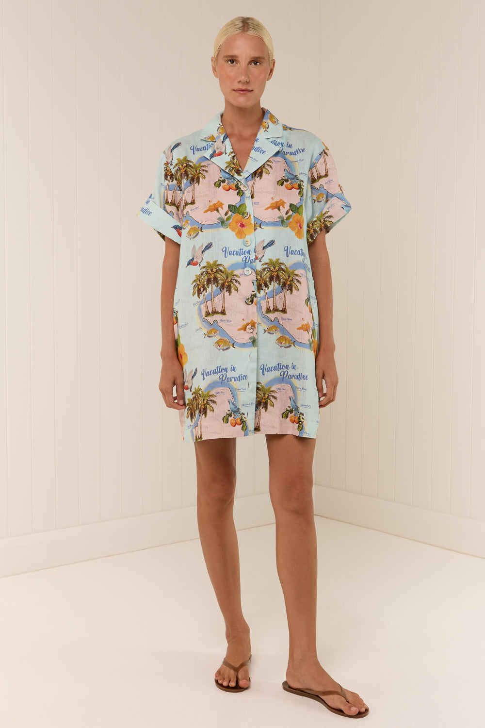 The Rey Dress in our exclusive Palm Paradise print is crafted from a premium Linen. Designed for a relaxed fit, the Rey Dress features a lapel collar, cuffed sleeves and statement button detailing, complete with a matching waist tie to cinch the waist for desired fit. Please refer to our size and fit guide for further fit details.